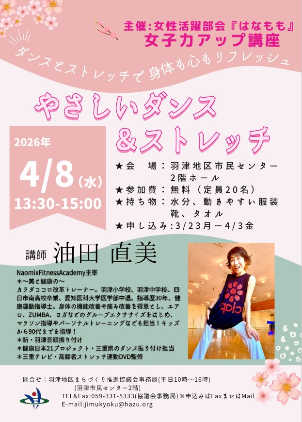 4月度の女子力アップ講座は「やさしいダンス&ストレッチ」です。
